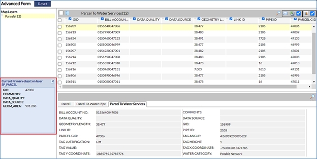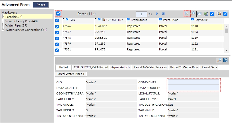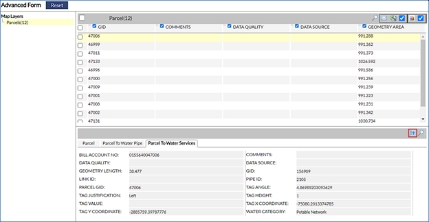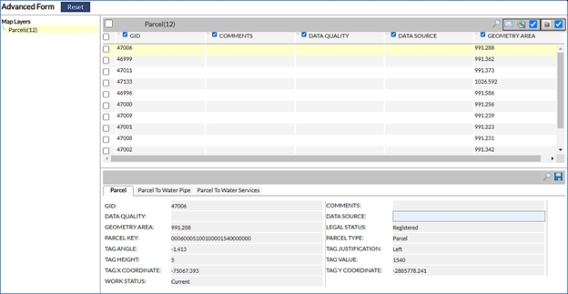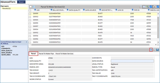 The Advanced Form tool allows viewing and managing large amounts of information based on a selection of objects on layers within the map. To access this functionality first select one or more map features and then click on the Advanced Form button.