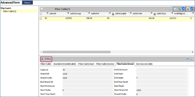 When the user executes an Advanced Form on a Fiber Cable, and selects the Fiber Cable Strand tab within the detail view, an option becomes available for the user to navigate between individual strands. Whilst navigating between the individual strands in a Fiber Cable, the detail view displays information pertaining to the strand selected.