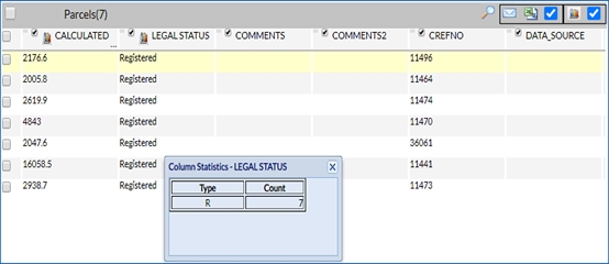 - List View: : Shows the attributes for each selected feature of a specific layer. For example, Parcel Type, Legal Status, Work Status, etc., are shown for each selected object belonging to the Parcels layer. Filter and options are included in the list view: