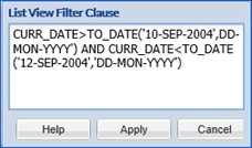 - Filter: A further option available in the Advanced Form list view is to filter the listed records. This can be achieved by selecting the filter icon and enter a where clause as shown in the example below. In this instance, the records displayed will be only those entered between the 10th and 12th of September 2004.