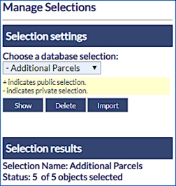 To load a selection saved in the database, choose it from the list and then click the Show button, the map will zoom to the features highlighted in that specific selection. When choosing a Selection to load, the Selection results are displayed below indicating the Selection Name and the number of objects included in the selection.