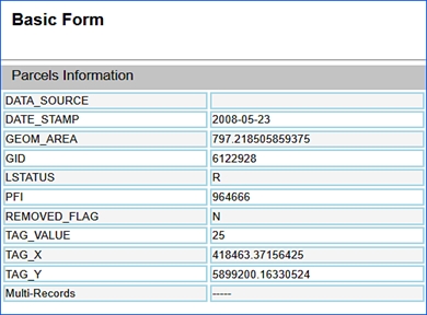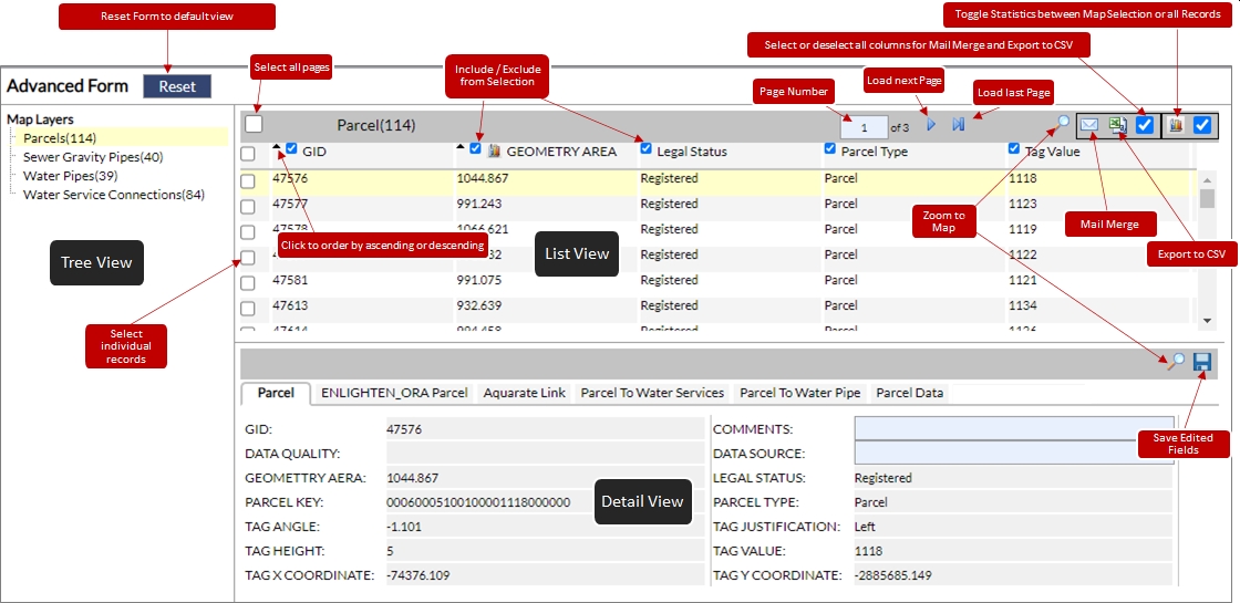 - The advanced form results window should be displayed, and the user can click on the desired layer in the tree view, to retrieve a list of records (within list view) and detailed results (detail view). For this example Parcels is selected, and in the detail view the user notices multiple tabs to toggle through correlated with Parcels.