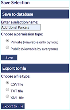 A side pane will appear on the right-hand side of the window, prompting the user to specify whether the selection should be private (may only be viewed by the current user) or public (may be viewed by everyone) and to type in a name for the selection. By clicking the Save button the selection will be posted to the database.