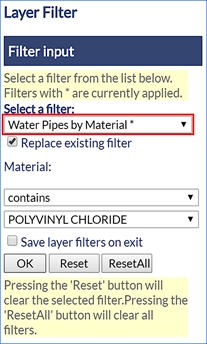The example above uses Water Mains Diameter and Water Pipes by Material which are layers based on the SP_WATPIPE spatial table. The user can see which filters are active by the asterisk next to the name.