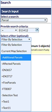 Selections can also be used to filter searches as described under the Search section. For example, if it is required to identify the lot and plan details of all the properties in a specific street of a specific town. As shown below, by using a saved selection of parcels highlighted on the map, the user can easily identify all properties in a certain town which has access to water.
