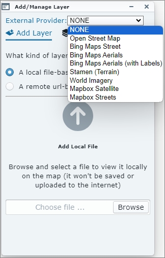 The Add External and Local Layers option allows users to set the background map or External Provider on which their own spatial data will be displayed. OpenStreetMap is a free, editable map of the whole world created by a community of mappers who contribute and maintain mapping data. Bing™ Maps is a web mapping service provided by Microsoft's Bing suite of search engines and powered by Bing Maps Platform framework. Both of these frameworks are free to view as background information in enlighten.