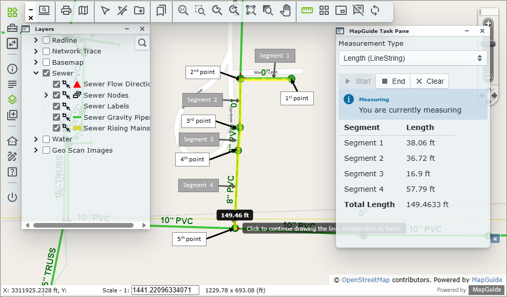 Fig: Example of measuring Length where distance is recorded in feet (ft) - When selecting the Clear button, the measurement lines are cleared from the map and the segment measurements in the Measure pane are reset.
