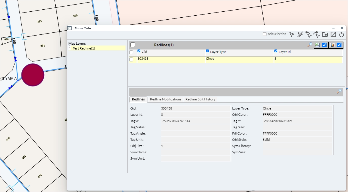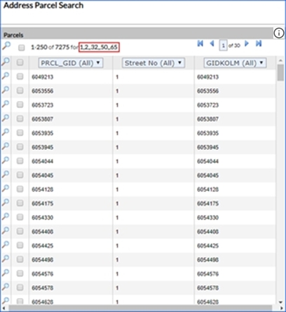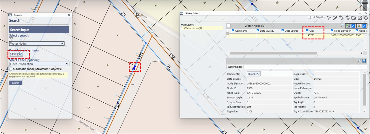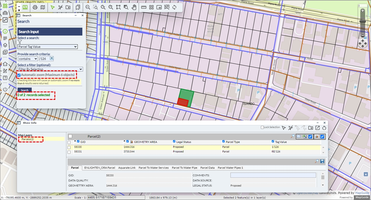 Fig: Refresh Features Selected on the Map Plot Application - Search Results: The search results displayed are dependent on the search configured for the plot and will vary. When a feature is selected on the map the results will automatically populate the fields defined.