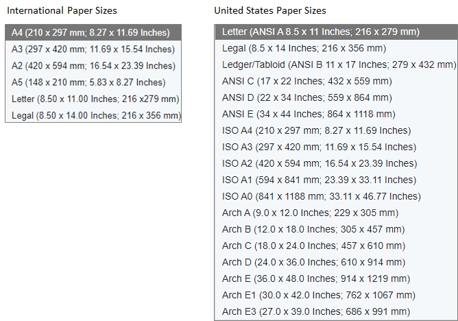 Fig: Quick Plot pre-configured Paper Sizes for mm and inches
