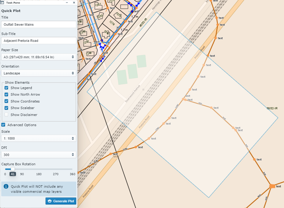 QuickPlot has Advanced Options allowing the user to set the map scale, DPI and orientation. When selected, a message is displayed indicating the current default Page Size and Scale applied.