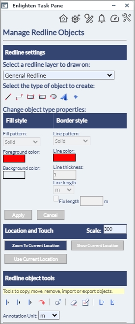 The unit displayed within the measure tool pane is determined by the UNIT defined in the Map Projection setup for the enlighten base map. If the UNIT parameter in Projection definition is set to Feet, the measuring length is displayed in ft, and conversely, if the UNIT parameter in Projection definition is set to Meters, the measuring length is displayed in m.