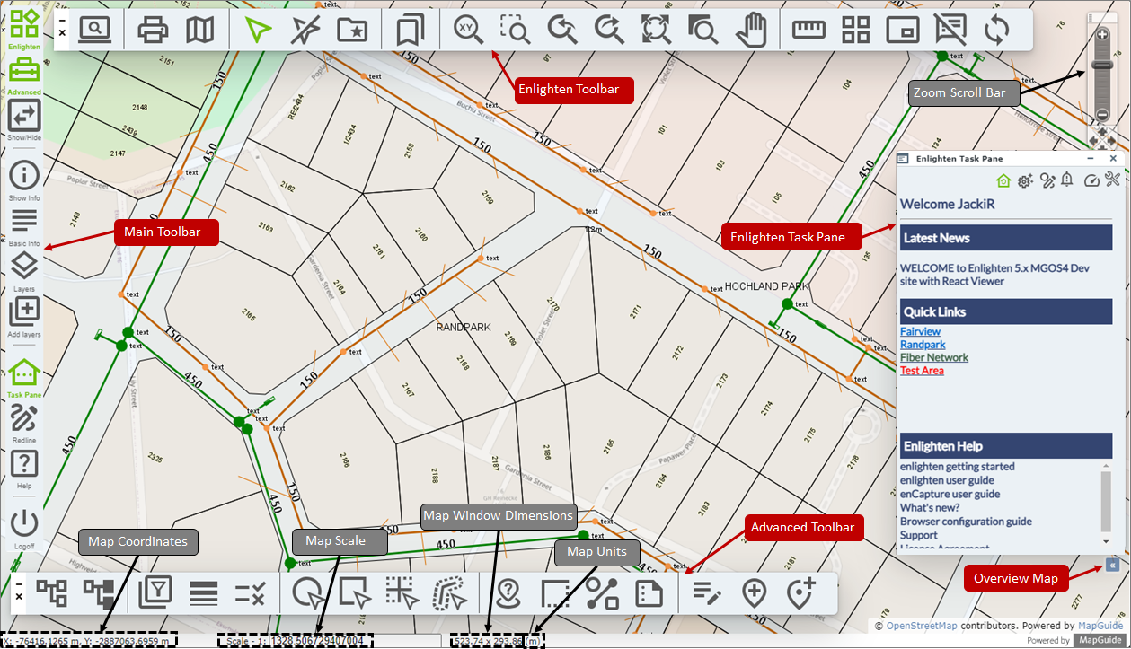 - Main Toolbar: The Main Toolbar is always displayed and contains icons for Layers, Information panes and the Enlighten Task Pane.
