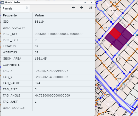 The Basic Info icon opens the Selection pane where the object's basic information is read directly from the spatial table. If multiple objects from different map layers are selected, the Selection pane displays a drop-down list in the top left corner where the user can select the required layer and then page through the details per map object selected using the
