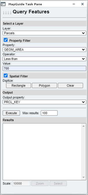 Fig: Custom Query Spatial Filter - Select the Property to display in the resultant list which uniquely describes the feature, for example PRCL_KEY.