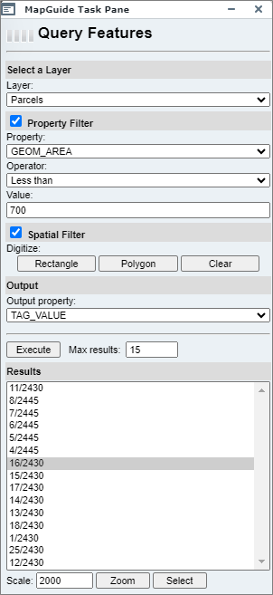 The Custom Query Builder tool provides a mechanism to filter features on a layer by specifying criteria based on the feature properties. The user also has the option to apply a spatial Rectangle or Polygon filter to specify the geographical extents on the map to apply to the query. From the resultant list, the user can select an object to zoom to or to add to a selection set.