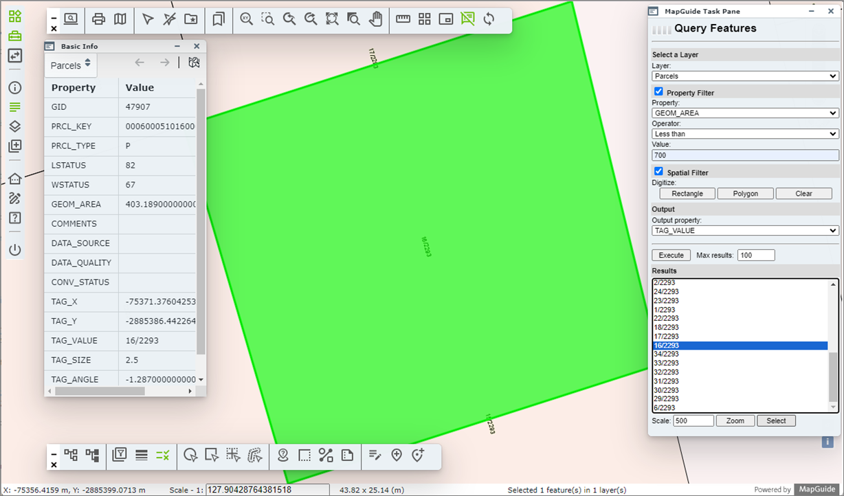 Fig: Custom Query Builder criteria and results - The user can select one of the records in the Results window so that it is highlighted, and select the Zoom button to zoom to the extents of the feature at the scale specified in the Scale text box, for example: 1:2000.