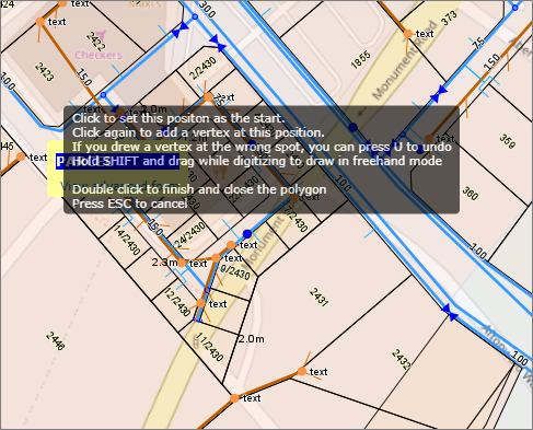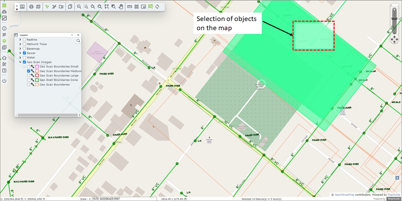 - Zoom to the specified location on the map and switch on the required map layers to display utility information such as the sanitary sewer pipes as well as the Geo-scan boundary layer/s. This will differ for each customer depending on how the geo-scan boundary layer is authored on setup.