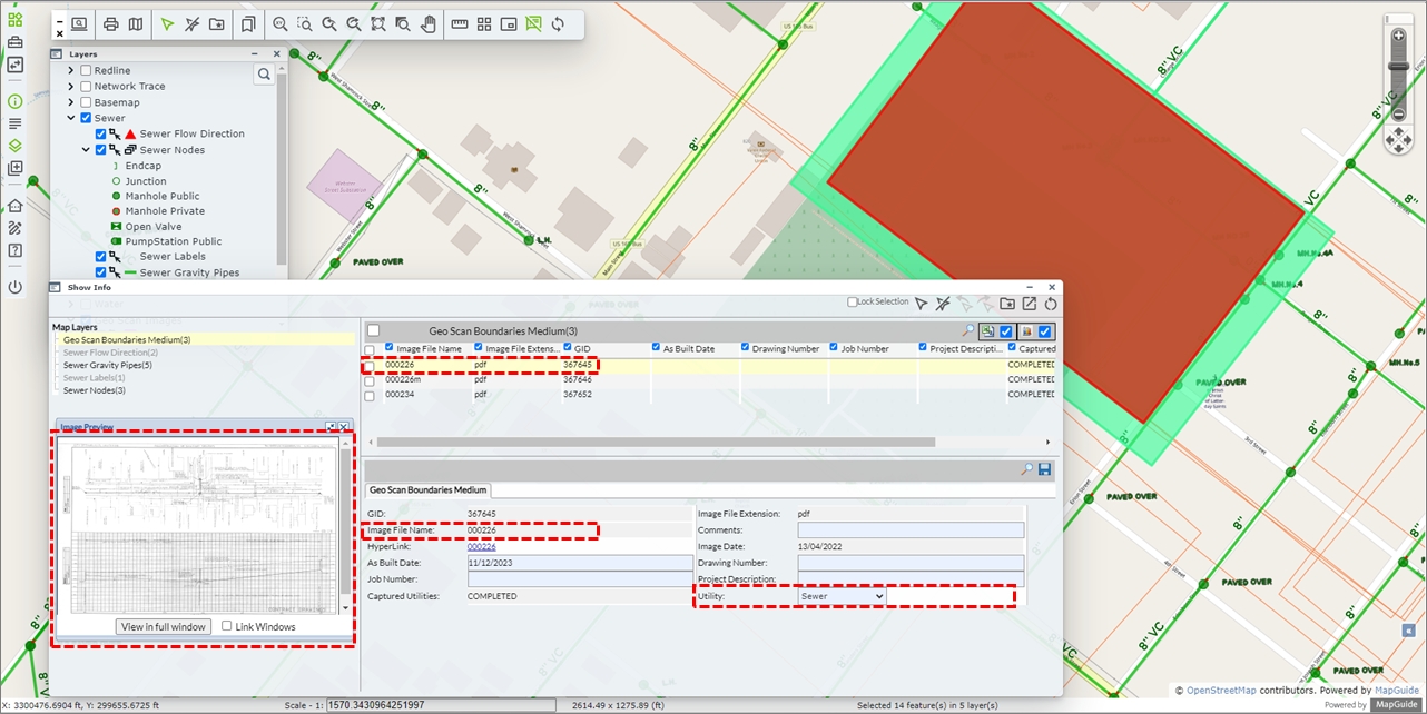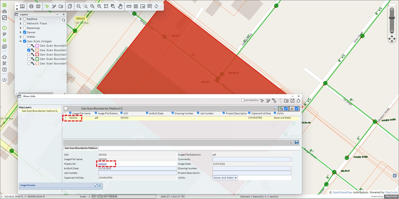 The user can select objects located at a specific location, such as a street intersection, and views the list Geo-scan images which intersect that intersection on the Show Info pane based on the selection set and which layers are switched on for display. The original scanned image can be viewed using the hyperlink setup on Show Info and can also view the scanned image which has been geographically referenced, scaled, and rotated in Munsys. The Geo-scan layer is inserted just above the topmost raster or tile-set layer for display purposes so that all utility layers can be viewed on top of Geo-scan layer.