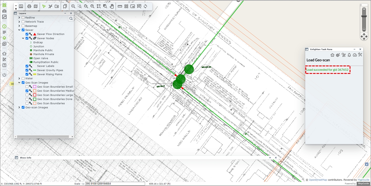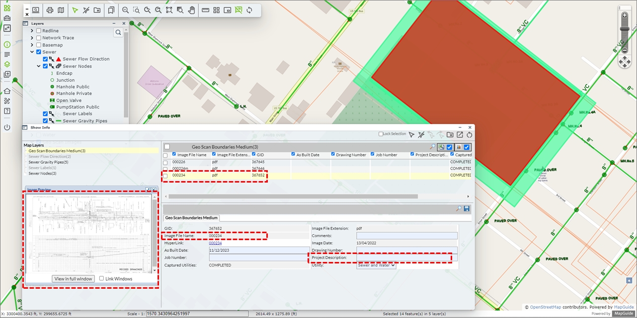 The geo-scan boundary is used as a geo-referenced frame for the as-constructed image to enable the users to identify the physical location of the as-constructed plan. The geo-scan image can then be loaded into the frame at the positioned scale and rotation to provide a backdrop of the captured utility assets such as pipes and nodes. The Geo-scan image layer should be authored to display below all other layers so that parcel and utility data can be viewed on top of the geo-scan image when loaded.