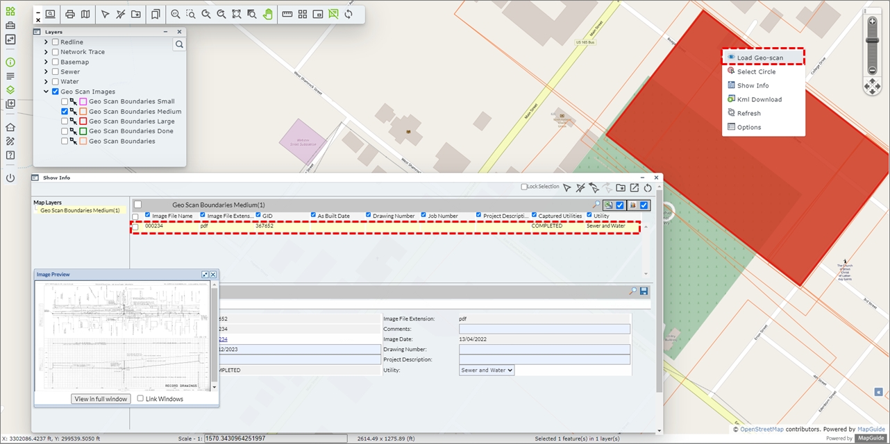 Fig: Load the Geo-scan image from the Context Menu - You can zoom in and out of the map while navigating around the scanned As-Constructed Engineering image to check that what has been captured in the GIS spatial tables matches what was constructed in the field.