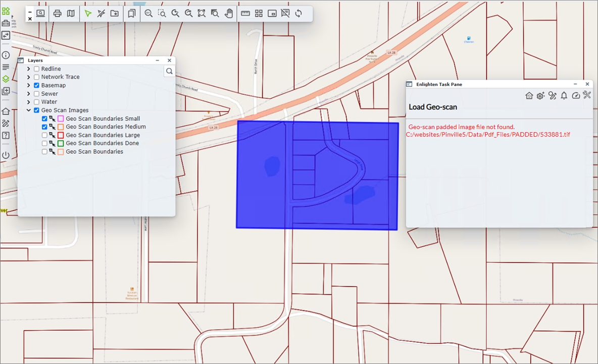 - Should a Geo-scan image fail to load in the map, an error message is displayed in the Enlighten Task pane indicting the name and location of the file being referenced in the URL for the selected Geo-scan Boundary. Refer the error message to your Administrator to check that the file exists on the enlighten server in the specified folder location.