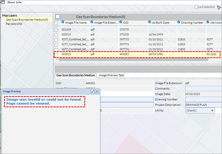Fig: Geo-scan Image failed to load - In the event geo-scan images cannot be located when previewed in the Show Info pane, or the image file extension type does not match what is stored in the database, an error message is displayed in the preview pane indicating that the selected geo-scan image is either invalid or cannot be found in the file path / file name columns stored in the database.