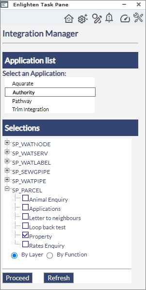 The Enlighten Task pane asks the user to choose the target layer and the spatial function. The type of feature selected will appear in red text and the target layer will appear in blue text. A selection set is auto-generated from the resulting features, and their attributes can be viewed in the Show Info pane by selecting the Show Info icon from the Main toolbar.