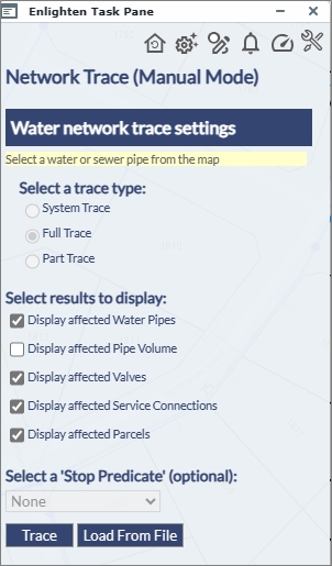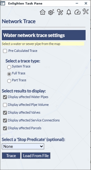 If a water pipe has been selected, the Water Network Trace Settings set up side pane will appear. If a pipe selection was saved to a file, this can be retrieved and traced on by selecting the Load from File option.