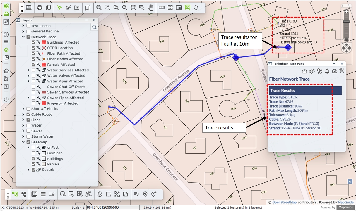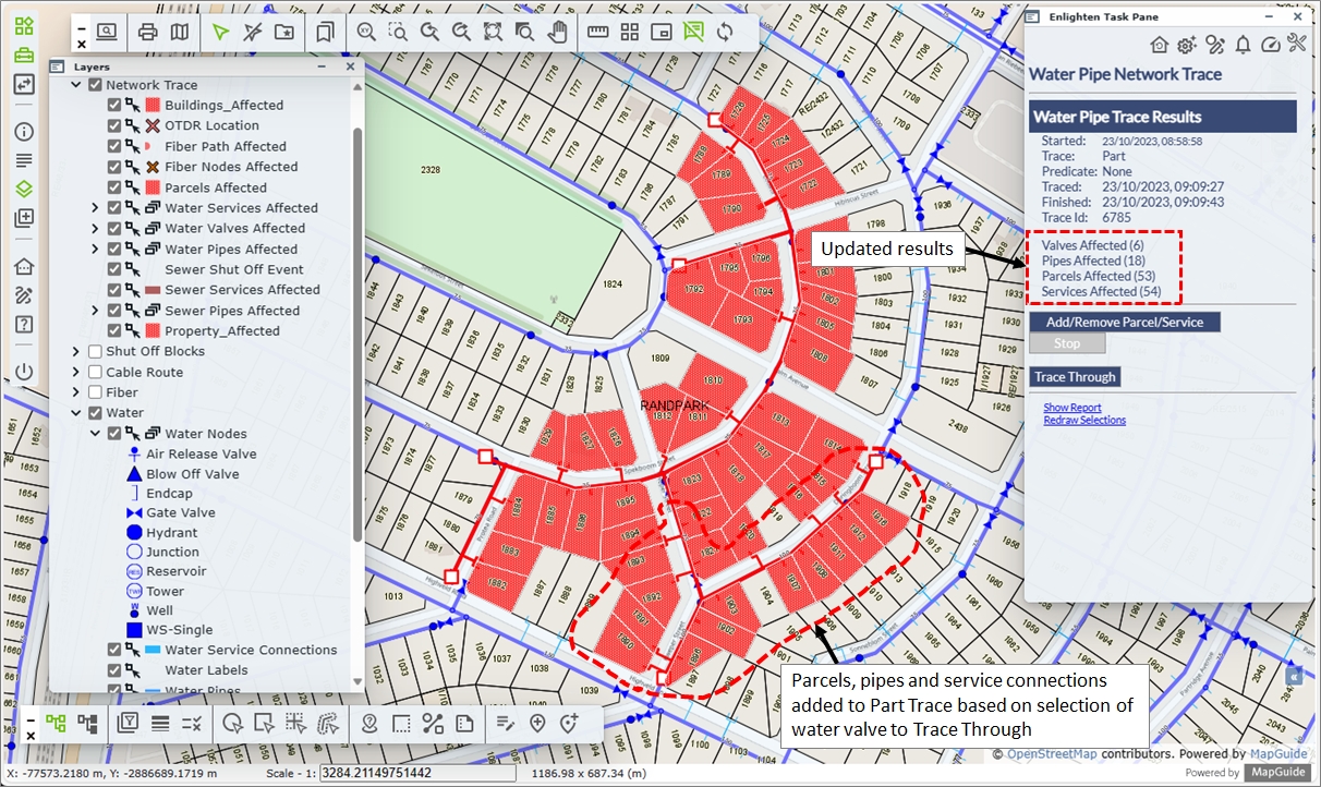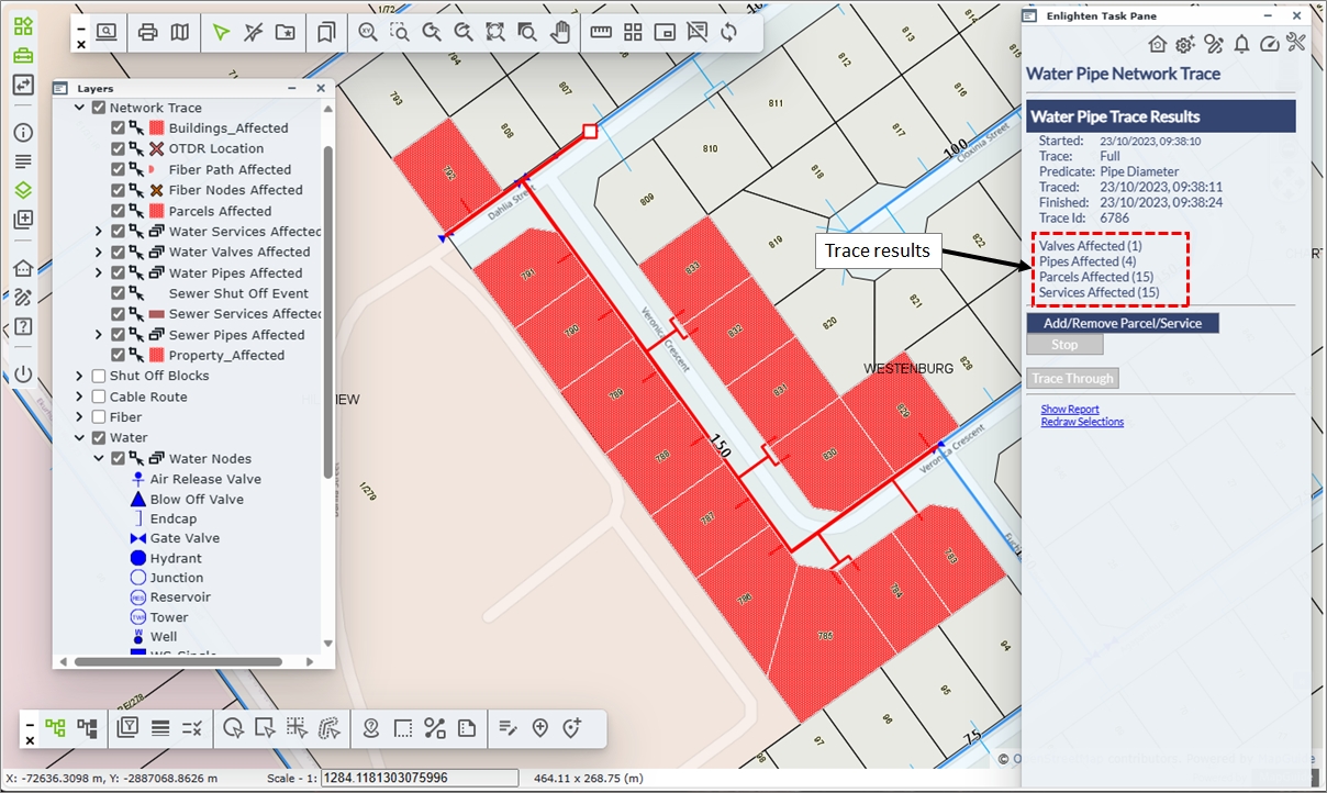 The map will be zoomed to the extent of the trace results and the affected objects highlighted along with the pipe volume if that option was selected.