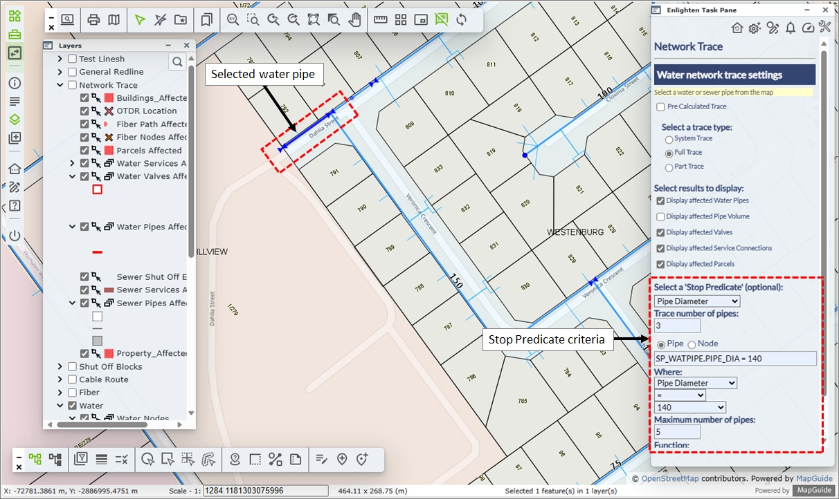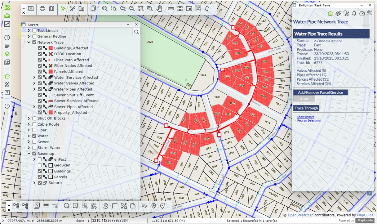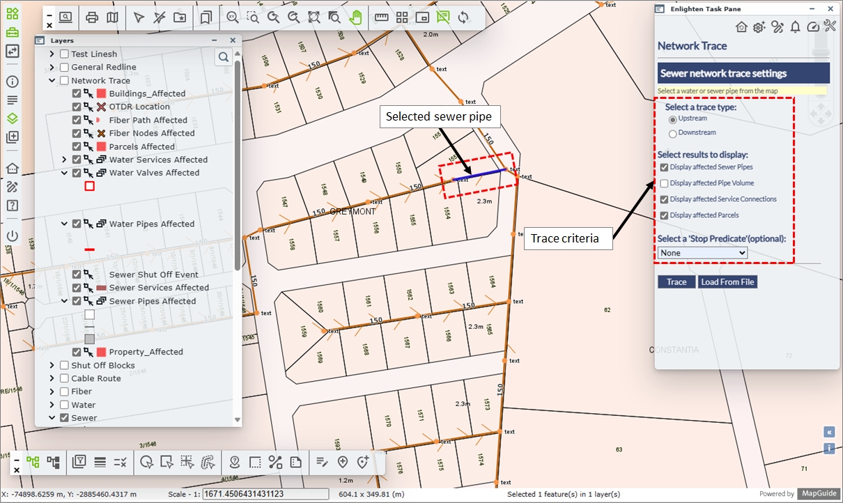 The Network Trace tool allows the user to determine which pipes, valves or parcels will be affected if a network is interrupted within the context of water/sewer utilities. Water/Sewer network tracing starts from a selected pipe and traces to find the connected nodes and pipes that would be affected if something were to happen to the selected pipe.