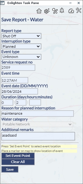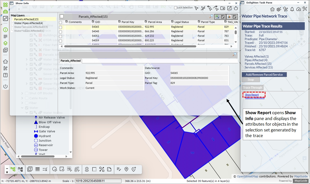 By selecting the Show Report option, the affected parcels, water pipes and service connections can be viewed in the Show Info pane if these forms have been defined. If on the Show Info pane the Map Layer count is displayed in black, it indicates there is an Advanced Form defined, whereas if the objects are displayed in grey, no form has been defined.