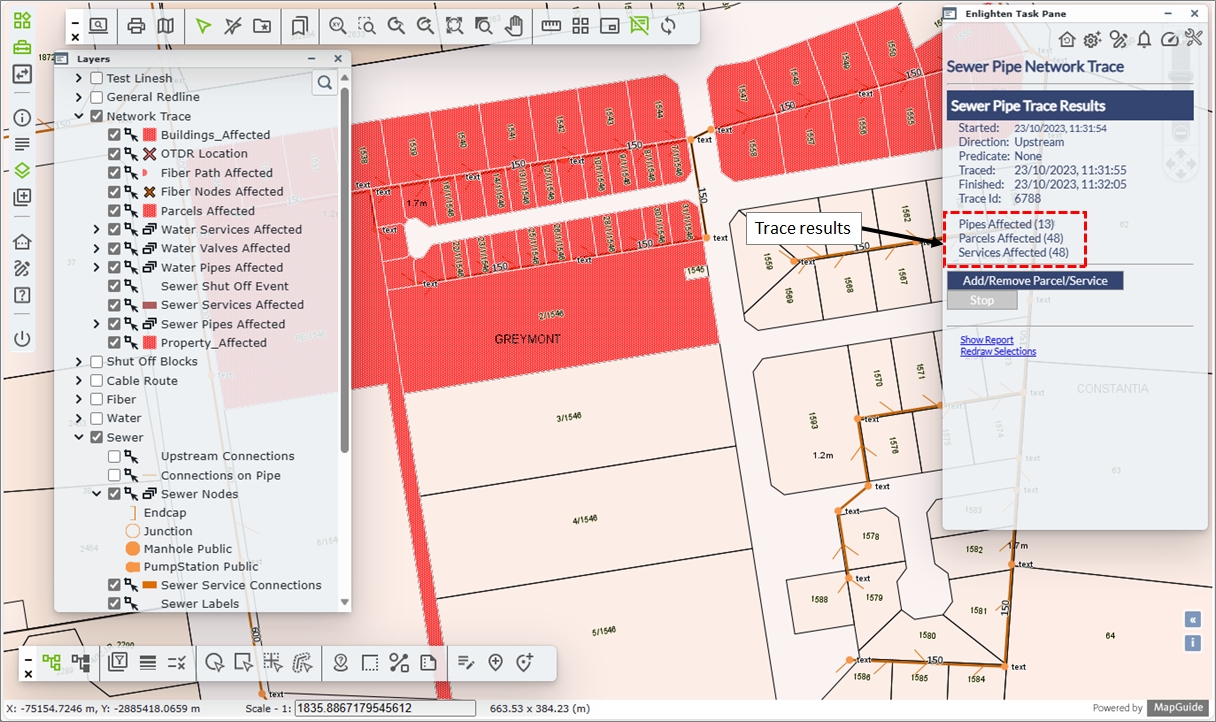 The map is zoomed to the extent of the trace results and the Affected Pipes and Parcels are highlighted and selected. The number of Pipes Affected and/or Service Connections and/or Properties/Parcels Affected is shown as part of the Sewer Pipe Trace Results.