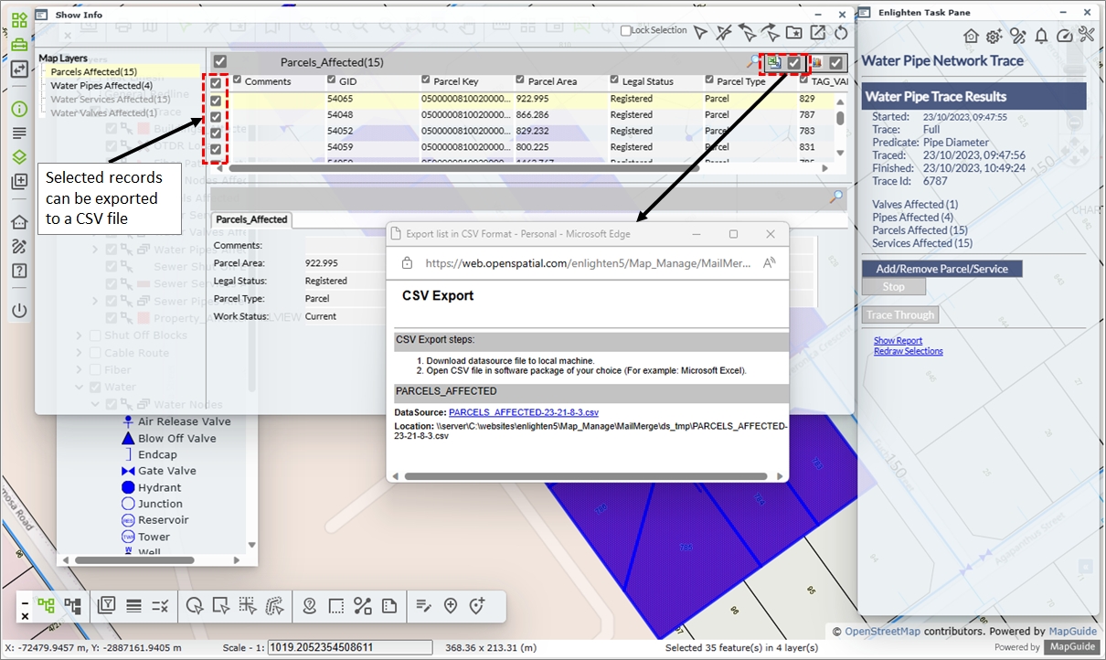 The Affected Parcel records displayed in the Show Info pane can be exported to a .csv file for reporting purposes by selecting the Export CSV button on the Show Info pane.