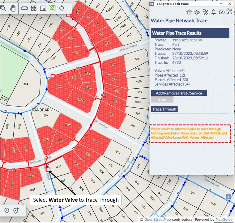 The results of the Water Pipe trace after applying the Stop Predicate are displayed in the Water Pipe Trace Results section on the side pane, and the affected Parcels, Pipes, Service Connections and Valves (based on the Selected Results to display) are all highlighted in the map.